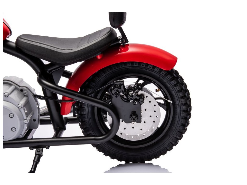 Motorka je vybavena nafukovacími koly, která si poradí i s nerovným terénem, a zadními kotoučovými brzdami s ručním ovládáním pro bezpečné zastavení. Pohodlné sedadlo z eko kůže zajišťuje komfort i při delší jízdě.