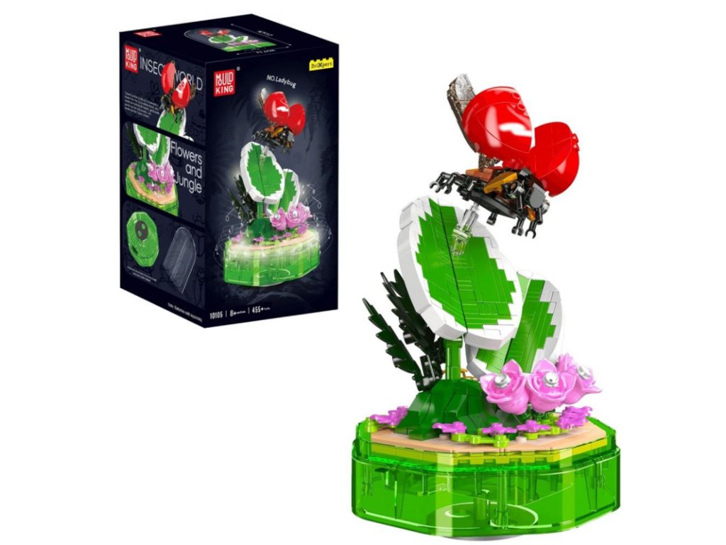Stavebnici sestavíte z 455 dílků podle přehledného návodu. Podstavec je otočný, hraje hudbu. Beruška je umístěna na lístku vedle rozkvetlých květin. Zahrádku můžete vložit do dózy a poté vystavit. Výsledný rozměr stavěbnice je 23,6 cm na výšku a 13,6 cm na šířku.