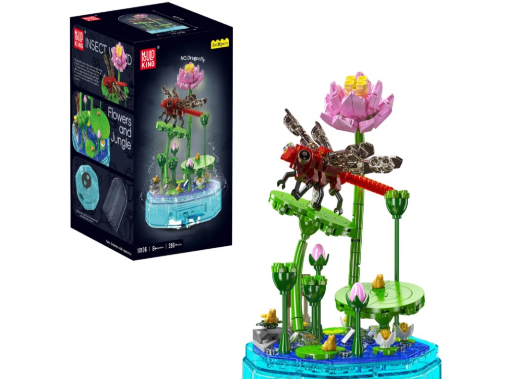 Stavebnici sestavíte z 396 dílků. Červená vážka sedí na zelených leknínech a růžových lotosových květech. To vše je umístěno na otočném podstavci s LED podsvícením. Podstavec hraje hudbu. Výsledný rozměr stavebnice je 23,6 cm na výšku a 13,6 cm na šířku.