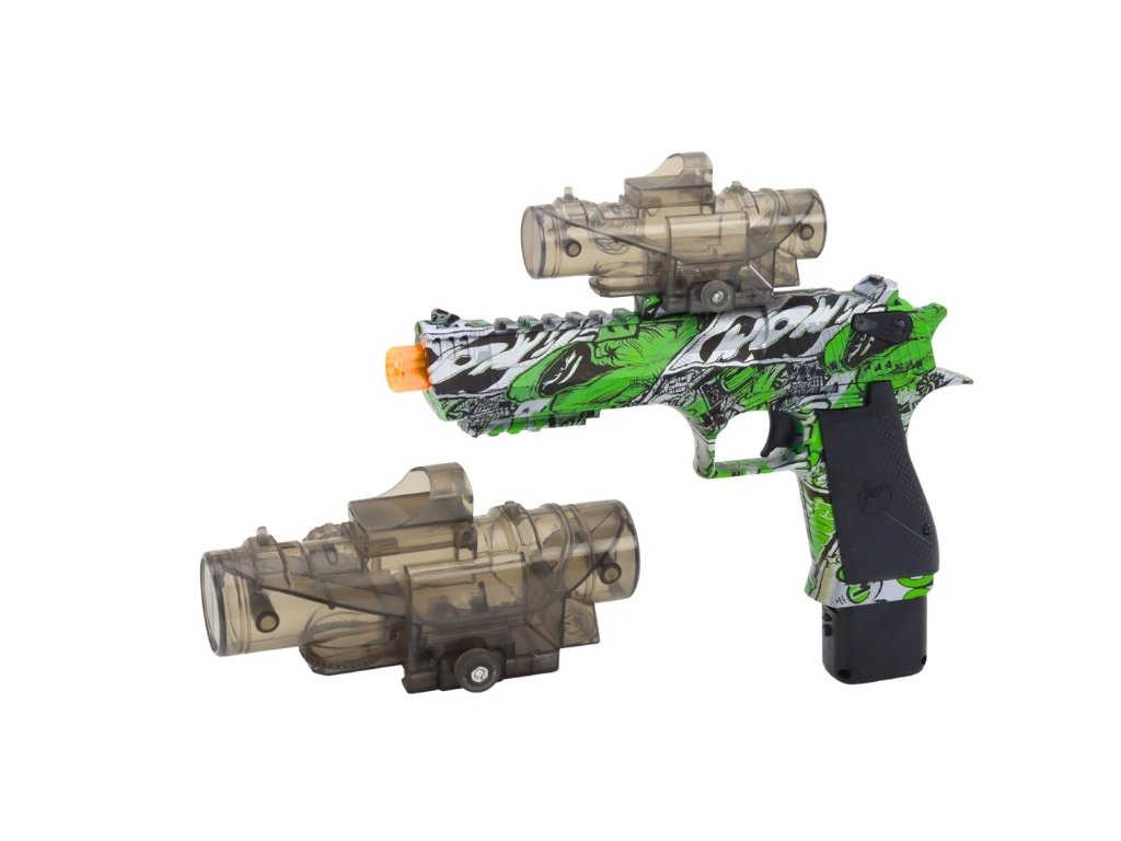 Zbraň zaujme na první pohled svým výrazným zeleným provedením, doplněným o stříbrné detaily a graffiti design, který jí dodává moderní a lehce futuristický „street“ vzhled 🔥. Díky tomu opravdu vynikne mezi ostatními hračkami.